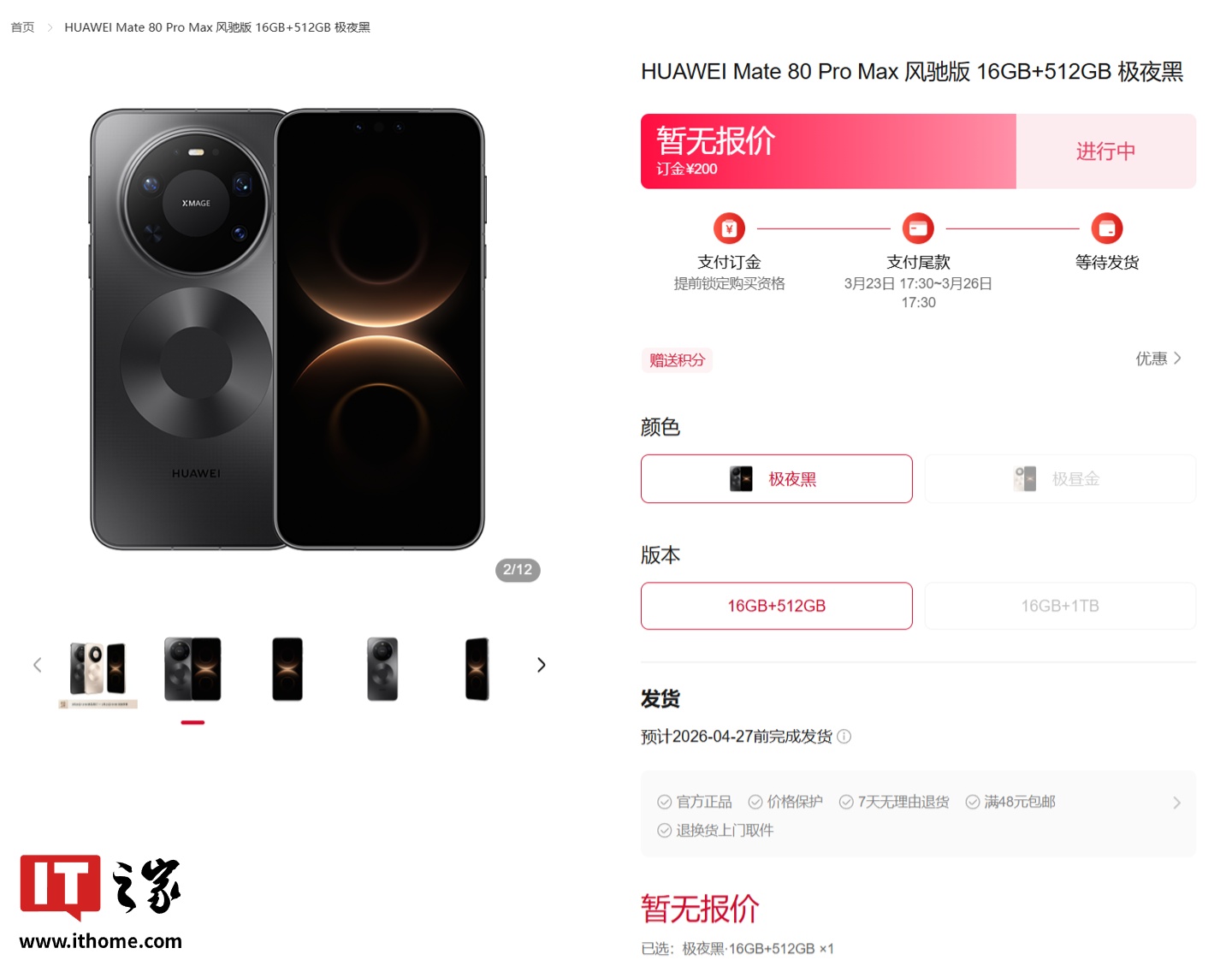 IT之家 3 月 22 日音信,华为 Mate 80 Pro Max 风驰版已于 3 月 20 日 12:08 开启预订,并将于 3 月 23 日发布会后开启全款预售。