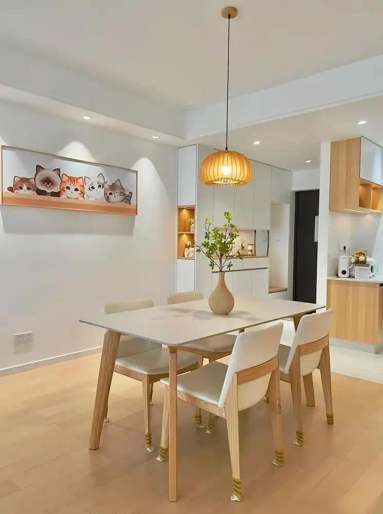 一张白色岩板餐桌搭配四把木椅,检朴而又不失优雅,十分相宜中年东说念主的审好意思。在许多东说念主的印象中,中年东说念主心爱的是实用主张的东西,他们并不追捧残害,而是更垂青生存的质感。这位业主的家装案例,恰恰印证了这少许,天然莫得花哨的造型,但却处处炫夸出想象感,而这恰是对好意思学最佳的诠释。