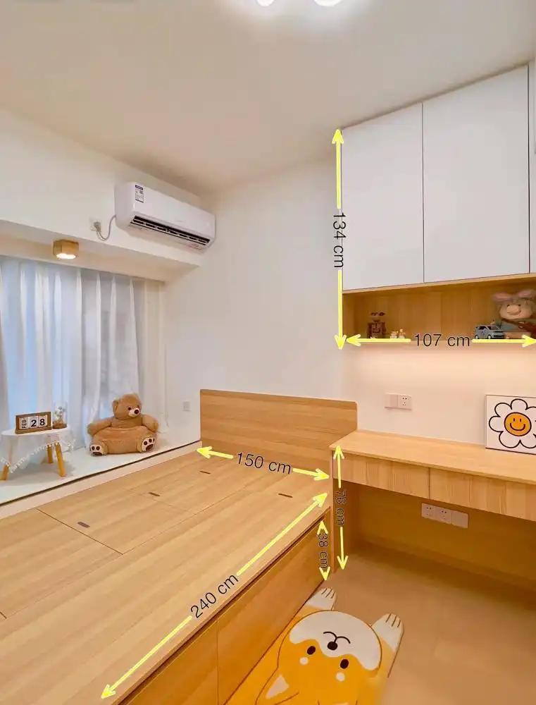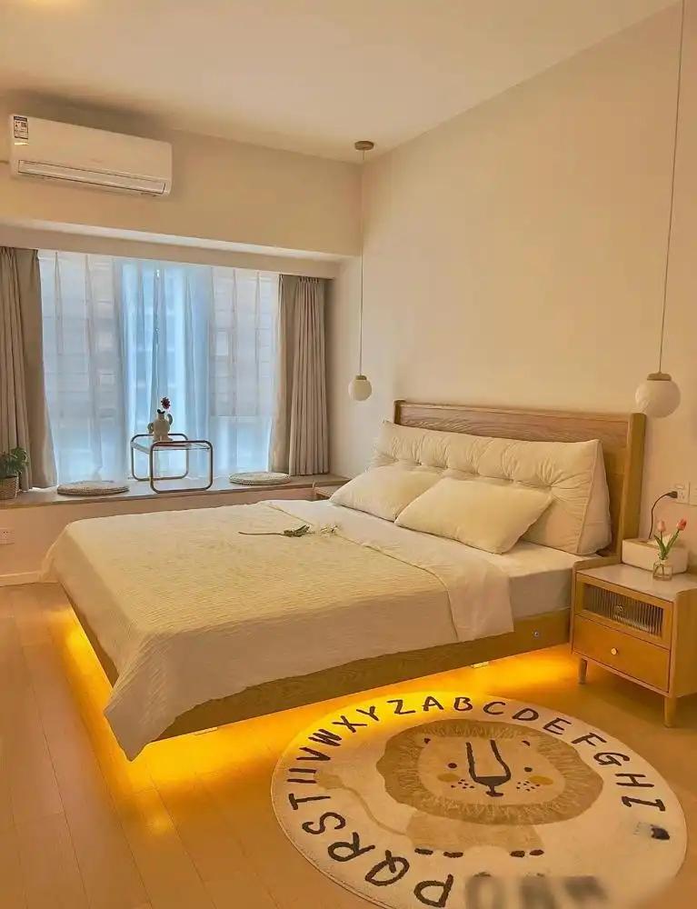 而主卧由于面积有限,传统的书桌放下去可能会影响房间的全体布局,因此想象师将书桌作念成悬浮的表情,不占用大地空间,还能让所有房间看起来愈加干净利落。