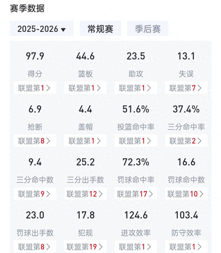场均得分97.9分,定约第一;场均篮板44.6个,定约第一;场均助攻23.5次,定约第一;场均盖帽4.4个,定约第一;投篮掷中率51.6%,定约第一;紧要效果和驻守效果亦然定约第一ued官方网站,说真话,看球这样多年,第一次看到一支球队这样无敌的,他们真要夺冠了。