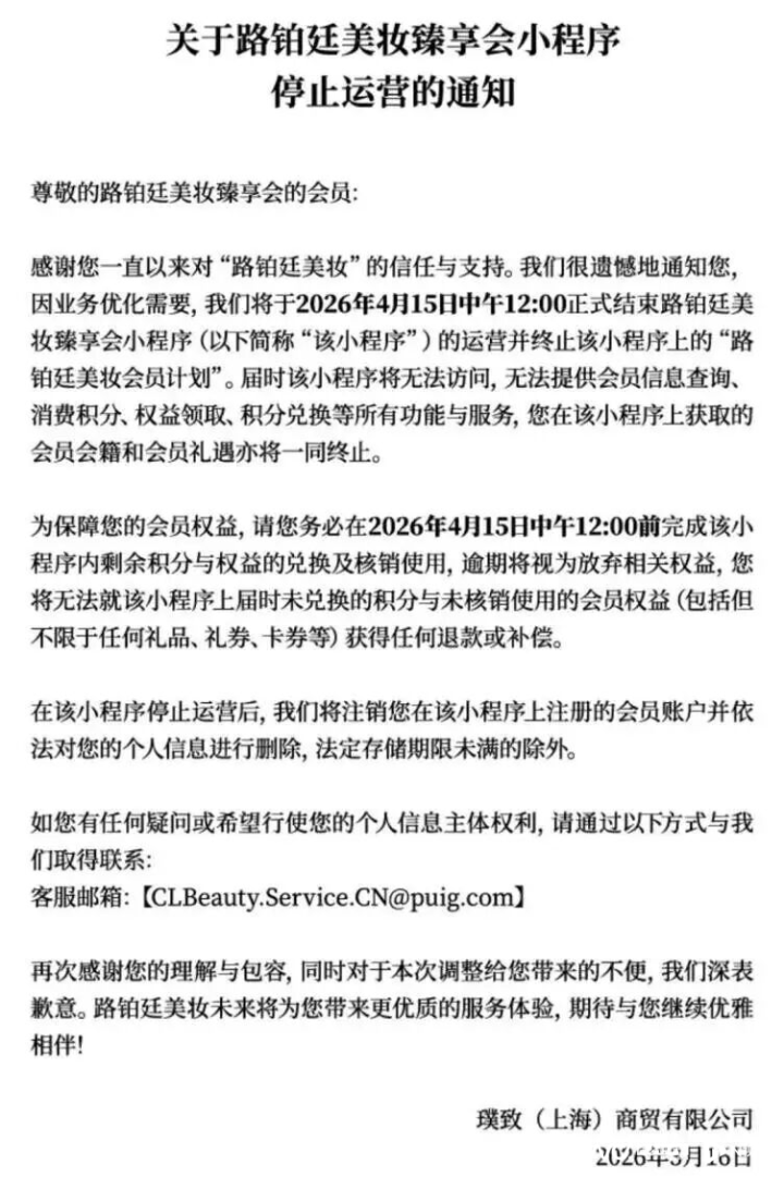 住手运营见知示意,hg真人将于2026年4月15日中午12:00端庄住手小要领运营,同期终结“路铂廷好意思妆会员磋议”,通盘会员联系的功能与奇迹、会员会籍及种种礼遇都将一并终结。见知相配辅导,会员需在2026年4月15日中午12:00前,完成小要领内剩余积分与各项权益的兑换、核销使用,若落后未操作,将视为自动烧毁,无法获取任何退款或补偿。小要领端庄停运后,会照章刊出通盘会员账户,并删除联系个东谈主信息,提醒会员实时处理联系事宜。